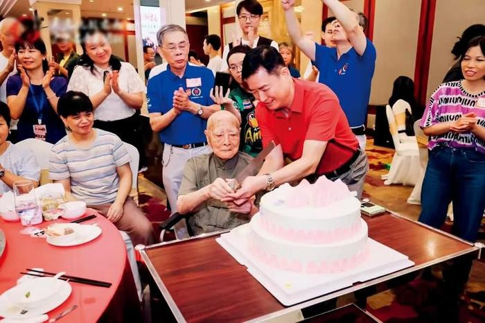 下图:2025年8月10日,关爱抗战老兵广东志愿者团队为广东黄埔军校同学会会长欧阳电庆生。本版图/受访者提供